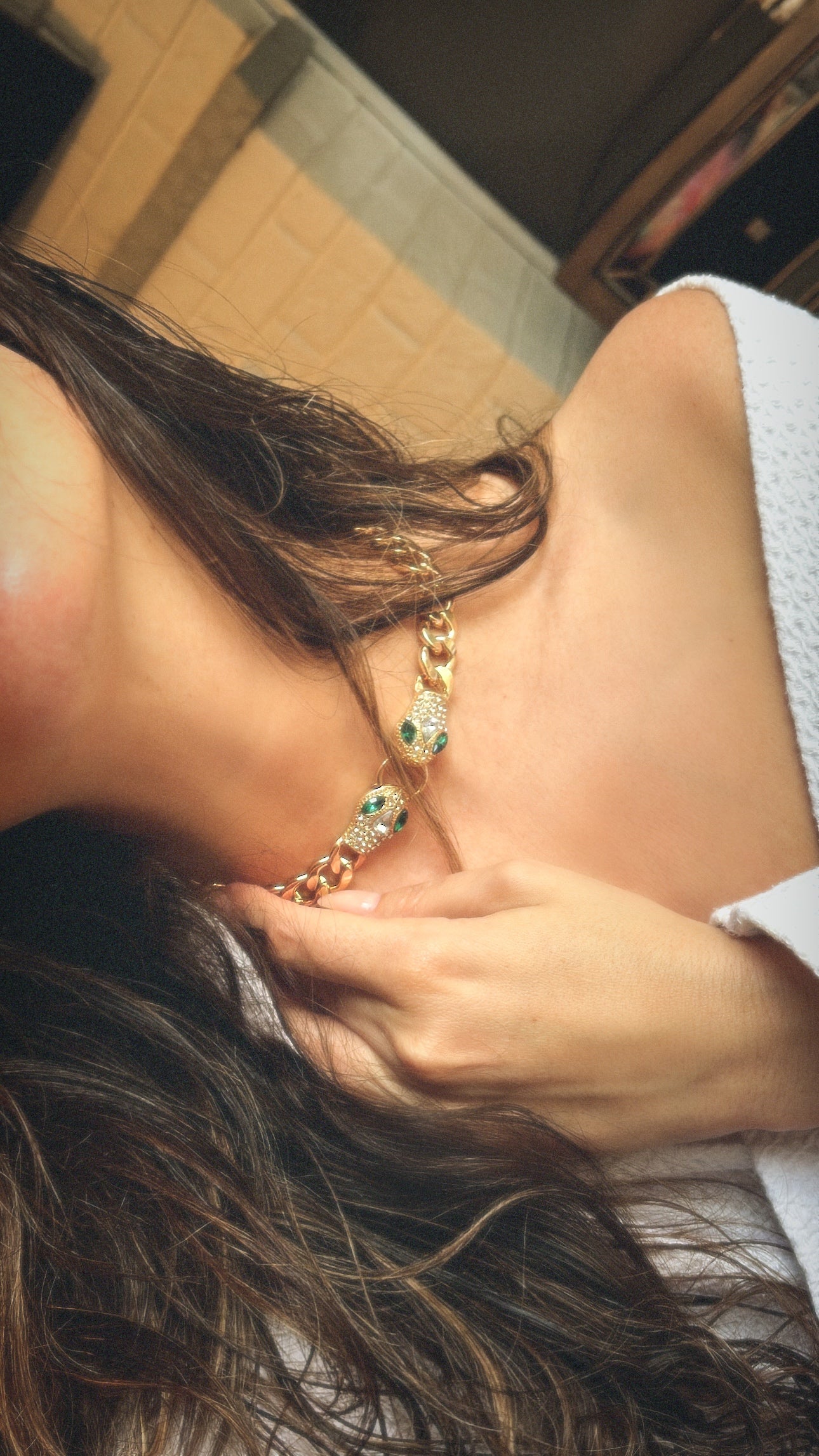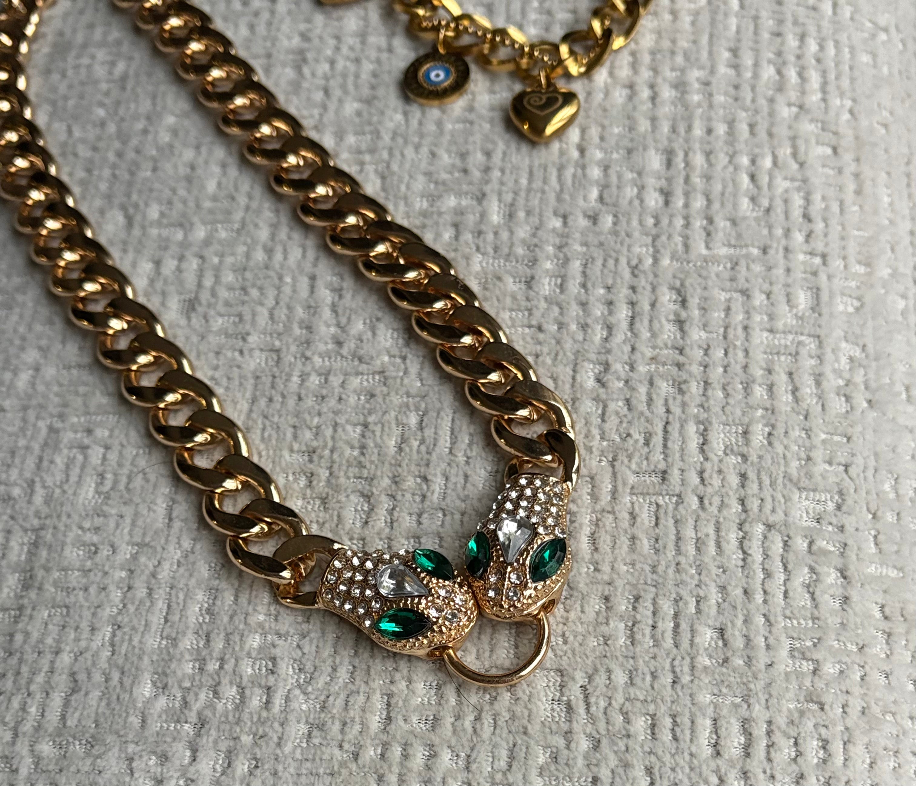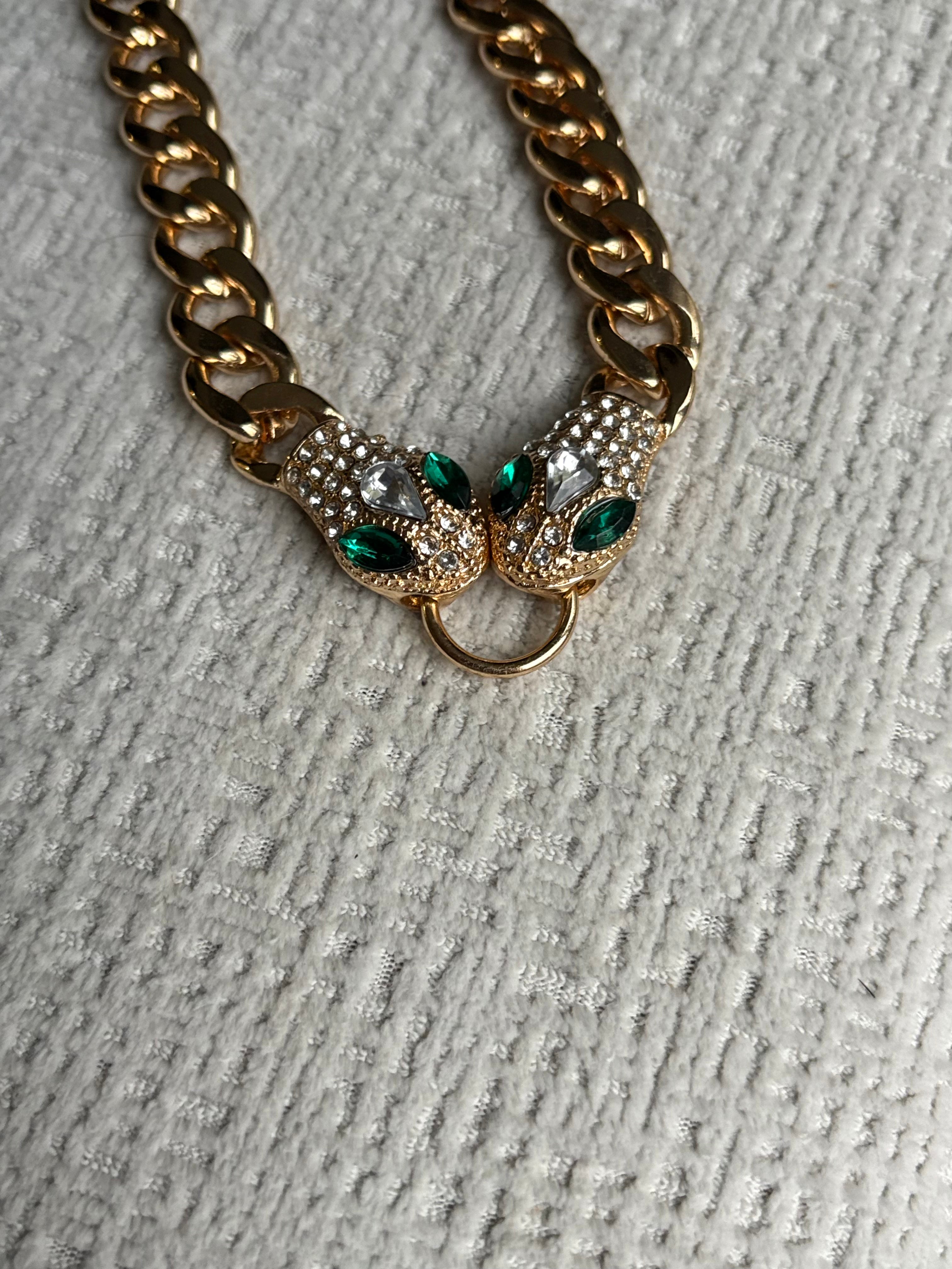 Thick gold links lead to twin serpent heads, each accented with emerald crystals that catch the light beautifully. It instantly elevates everything from a cozy dinner look to your sparkliest New Year’s outfit.